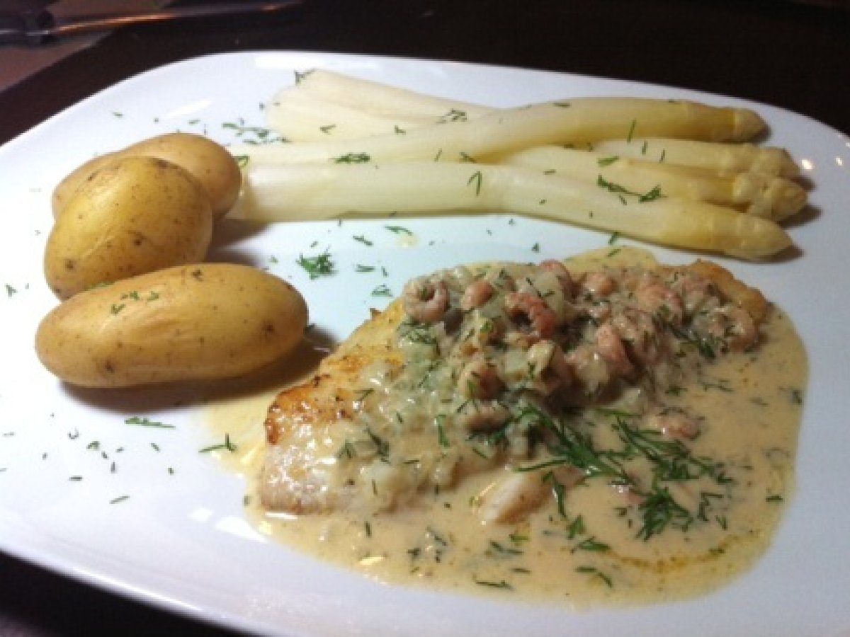 Mit den wolken ziehen: scholle mit nordseekrabben und spargel