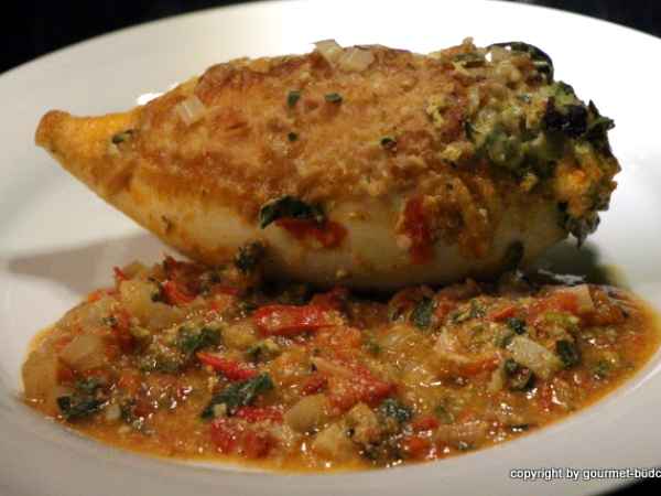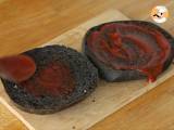 Der Körper: das Brötchen in zwei Hälften schneiden, das Innere 2 min in einer heißen Pfanne rösten. Verteilen Sie 2 Esslöffel Tomatensauce auf der Basis und 1 Esslöffel in den Kopf.