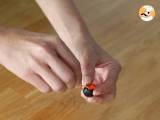 Die Augen: Mit einem Zahnstocher eine Pfefferstrecke in die schwarze Olive einführen und den anderen Teil wieder hineinlegen. Pflanzen Sie den Zahn auf der Seite der Olive und tun Sie das gleiche mit dem zweiten Auge.