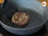 Mund: Kochen Sie ein gehacktes Steak ca. 4 Minuten auf jeder Seite. Tomatenscheiben schneiden.