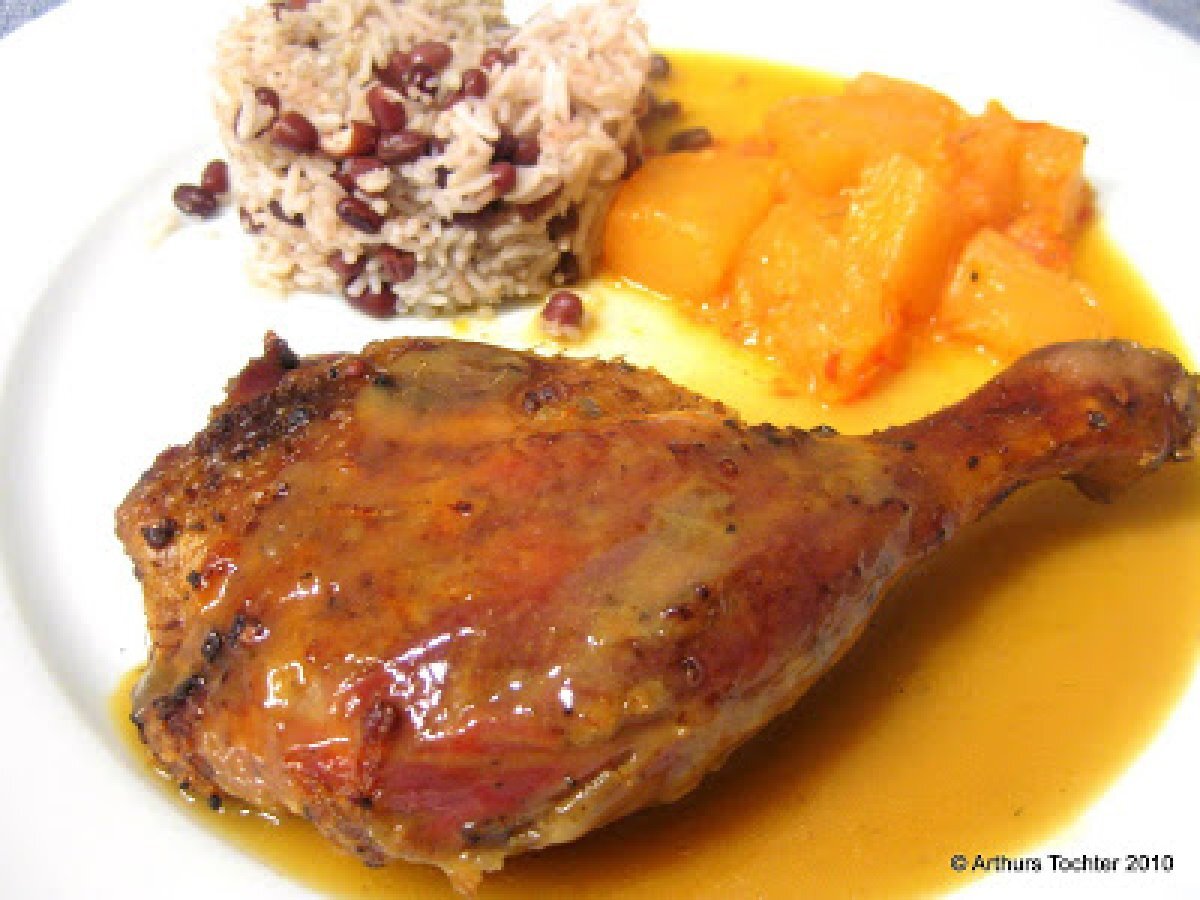 Entfaltung Ente geschnitzt Marinade Band etwas unter dem Grill, bis sie knusprig und flambiert mit Rum. - Als Beilage, war es außer Bohnen mit Reis, Ananas-Kompott und Blutorange, ich sauer-scharf mit braunem Zucker gekocht, Zimt Halbstock, Muskatblüte empfohlen und Chile.