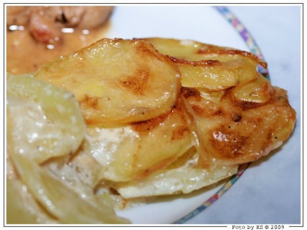 - Die Kartoffeln schälen, waschen und in dünne Scheiben schneiden (ca. 3 mm dick) cut. Die Birnen schälen und in dünne Scheiben zu schneiden.