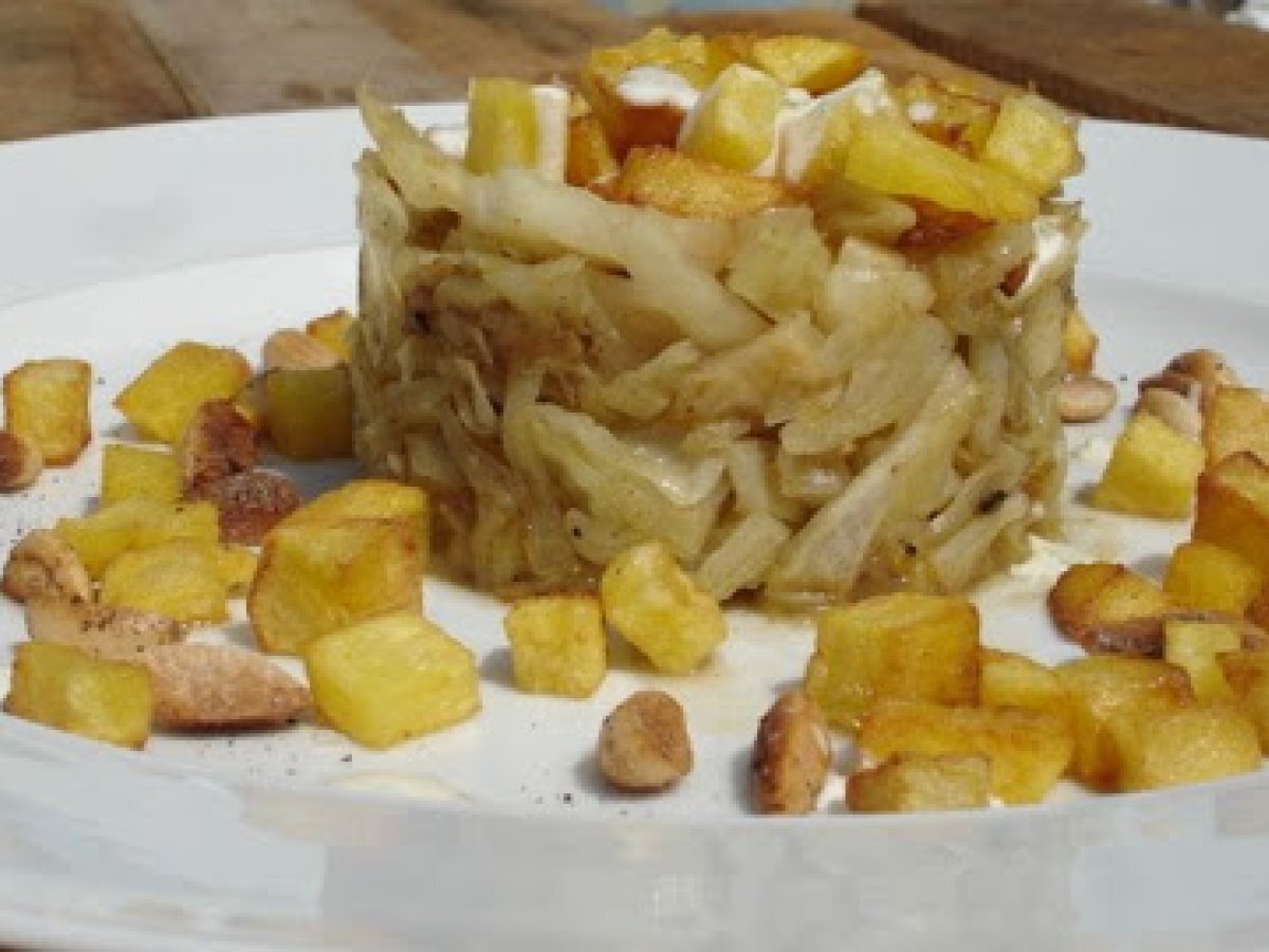 Nachgekocht: spitzkohltörtchen mit kartoffelcroutons und karamellisierten