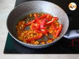 Die zerdrückte Knoblauchzehe und die gehackte Zwiebel im Fett der Chorizo anbraten, dann die in Streifen geschnittene Paprika dazugeben und einige Minuten mitbraten.
