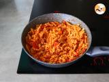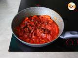 Das Tomatenmark und die Chorizo hinzufügen und abdecken. 20–25 Minuten köcheln lassen, damit die Paprika gut gar sind. Die Nudeln al dente kochen.