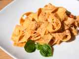 Wir haben Pappardelle verwendet, aber Sie können auch Tagliatelle oder kurze Nudelformen wie Penne Rigate, Mezze Maniche, Fusilli oder Farfalle verwenden