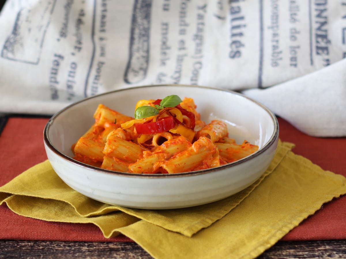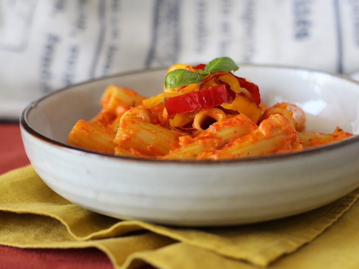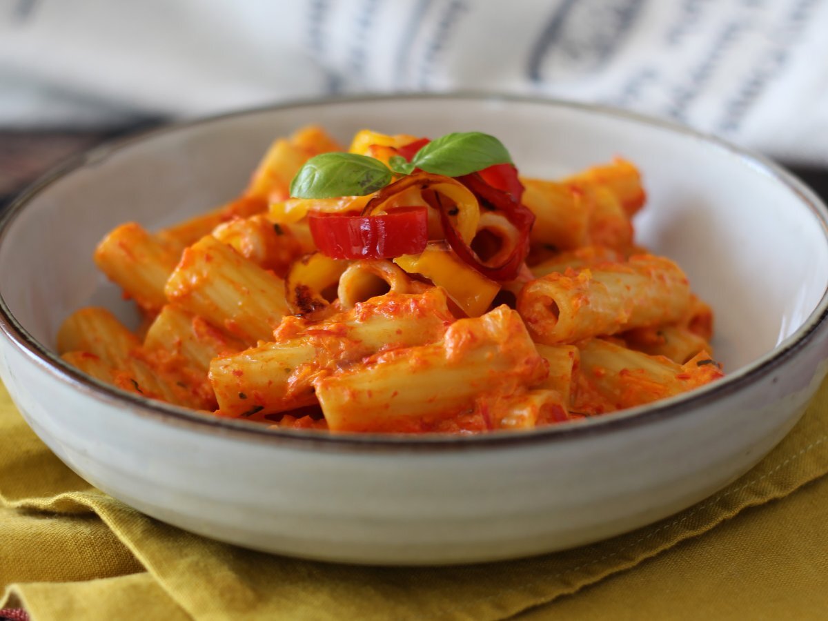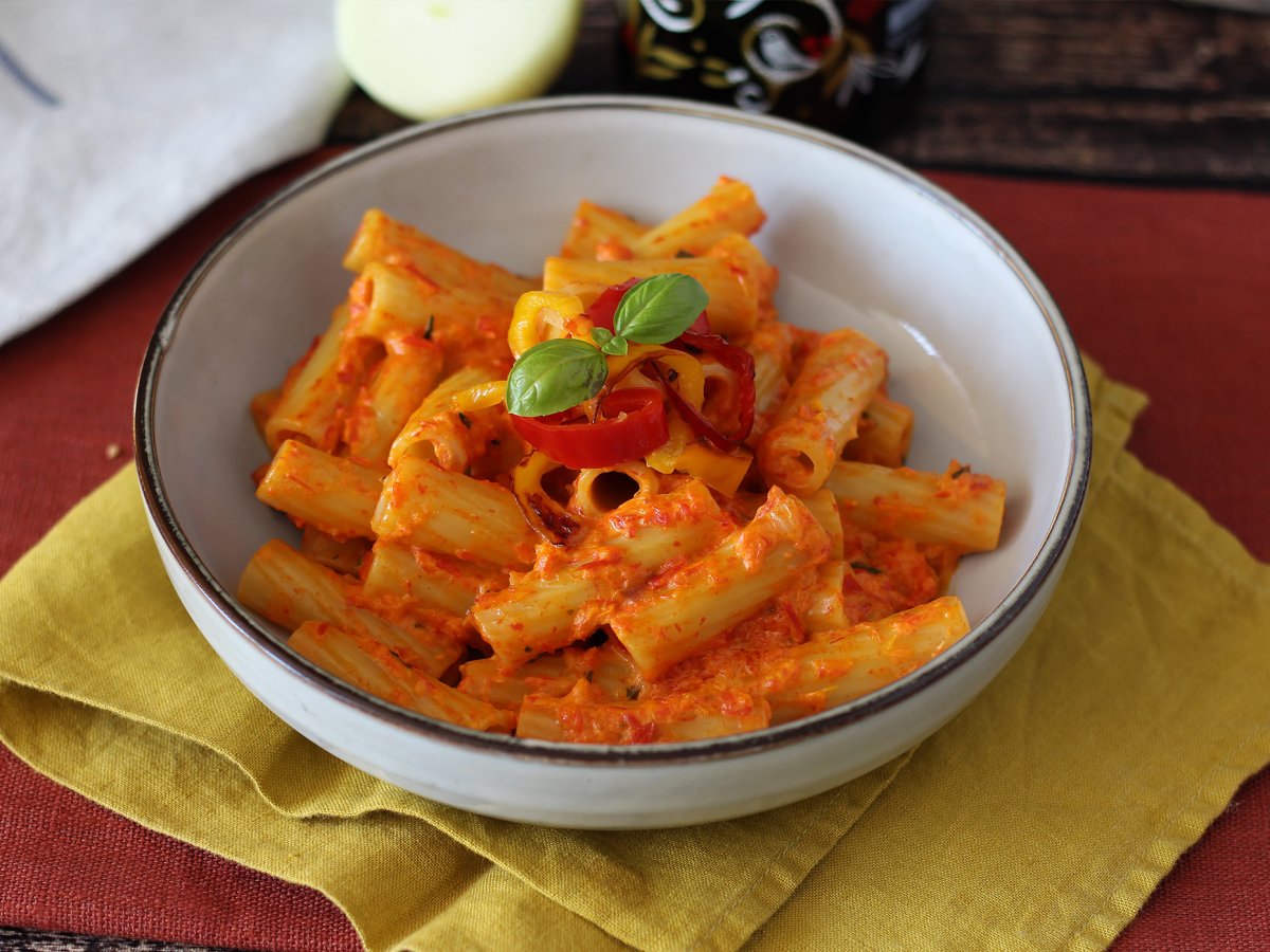 Für einen angenehmen Geschmack empfehlen wir eine Mischung aus roten, gelben und orangenen Paprikaschoten. Sie können diese Pasta aber auch mit nur einer Paprikasorte zubereiten.