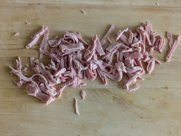 Zuerst den gekochten Schinken in Streifen schneiden.
