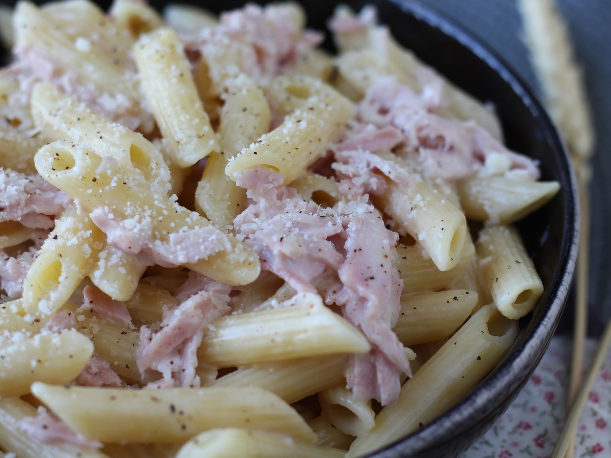 Wenn die Zeit knapp und der Hunger groß ist, gibt es ein Gericht, auf das sich alle einigen können: Pasta panna e prosciutto. Cremig, zart und unglaublich einfach zuzubereiten, ist es die ideale Lösung für die Tage, an denen man etwas Leckeres haben möchte , ohne sich stundenlang an den Herd zu stellen. Aber das ist noch nicht alles. Dieses Rezept ist nicht nur ein unwiderstehliches Wohlfühlessen, sondern auch eine großartige Idee zur Abfallvermeidung: Wie oft haben Sie schon ein paar Scheiben gekochten Schinken im Kühlschrank gefunden ? Das ist die perfekte Gelegenheit, daraus ein schmackhaftes und sättigendes Gericht zu machen, das mit Kreativität und Geschmack die Abfallmenge in der Küche reduziert. Pasta panna e prosciutto ist ein zeitloser Klassiker, der auf italienischen Tischen immer präsent ist und den Gaumen aller (auch der Kleinen) zu erobern weiß. Dieses Gericht eignet sich perfekt für ein Last-Minute-Essen, ein Familienessen oder ein gemütliches Beisammensein nach einem anstrengenden Tag und erinnert daran, dass auch Einfaches überraschend sein kann.