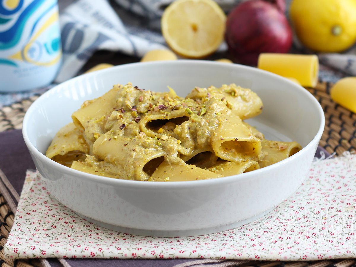 Thunfisch aus der Dose, Pistazien in der Schale, natives Olivenöl extra und Zitronensaft: Das ist alles, was Sie brauchen, um dieses cremige Pastagericht zu Hause zuzubereiten. Schnell und einfach: Während die Pasta kocht, können Sie die Pistaziencreme zubereiten und in 15 Minuten ein Rezept auf den Tisch bringen, das Ihre Gäste begeistern wird. Schlagen Sie Paccheri mit Thunfisch, Pistazien und Zitrone für ein schnelles Mittag- oder Abendessen vor, begleiten Sie es mit einem Glas trockenen Weißwein und fertig!