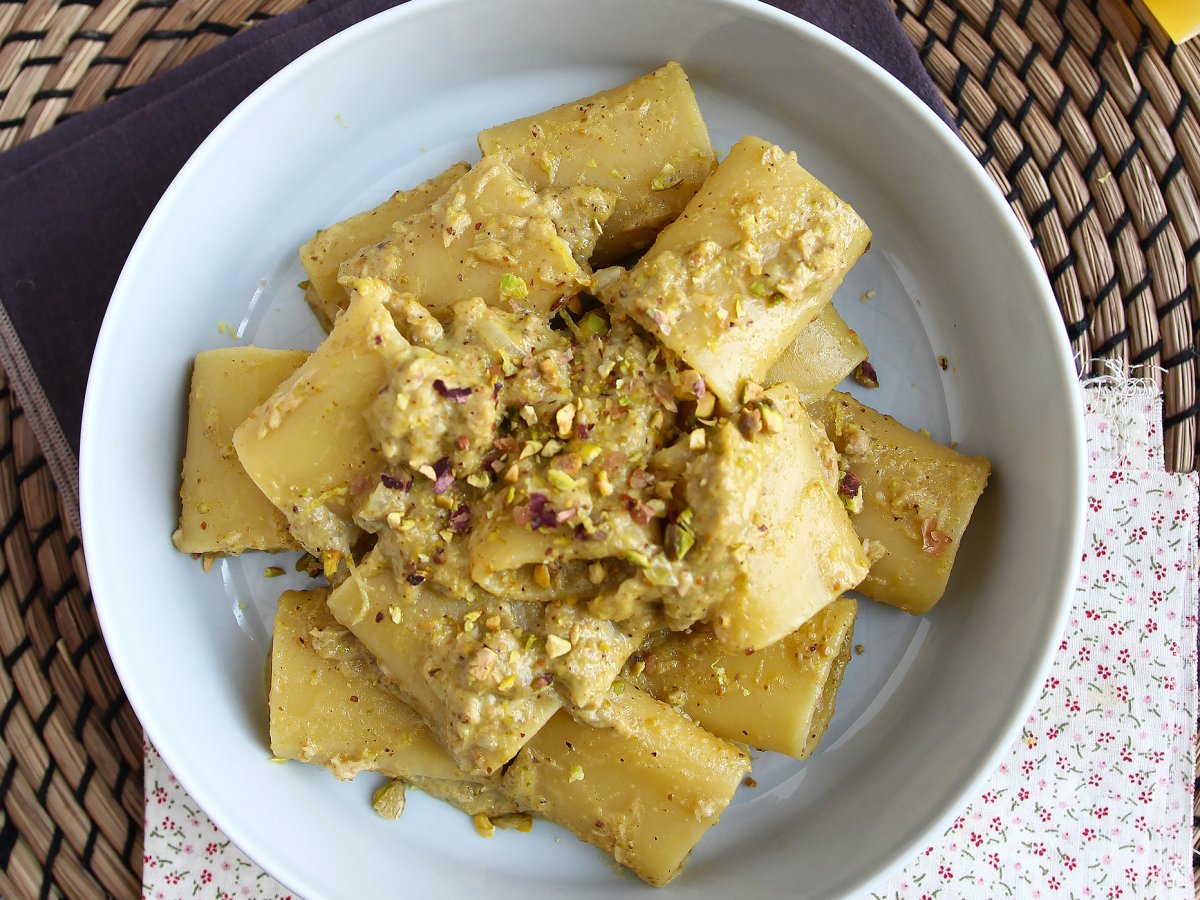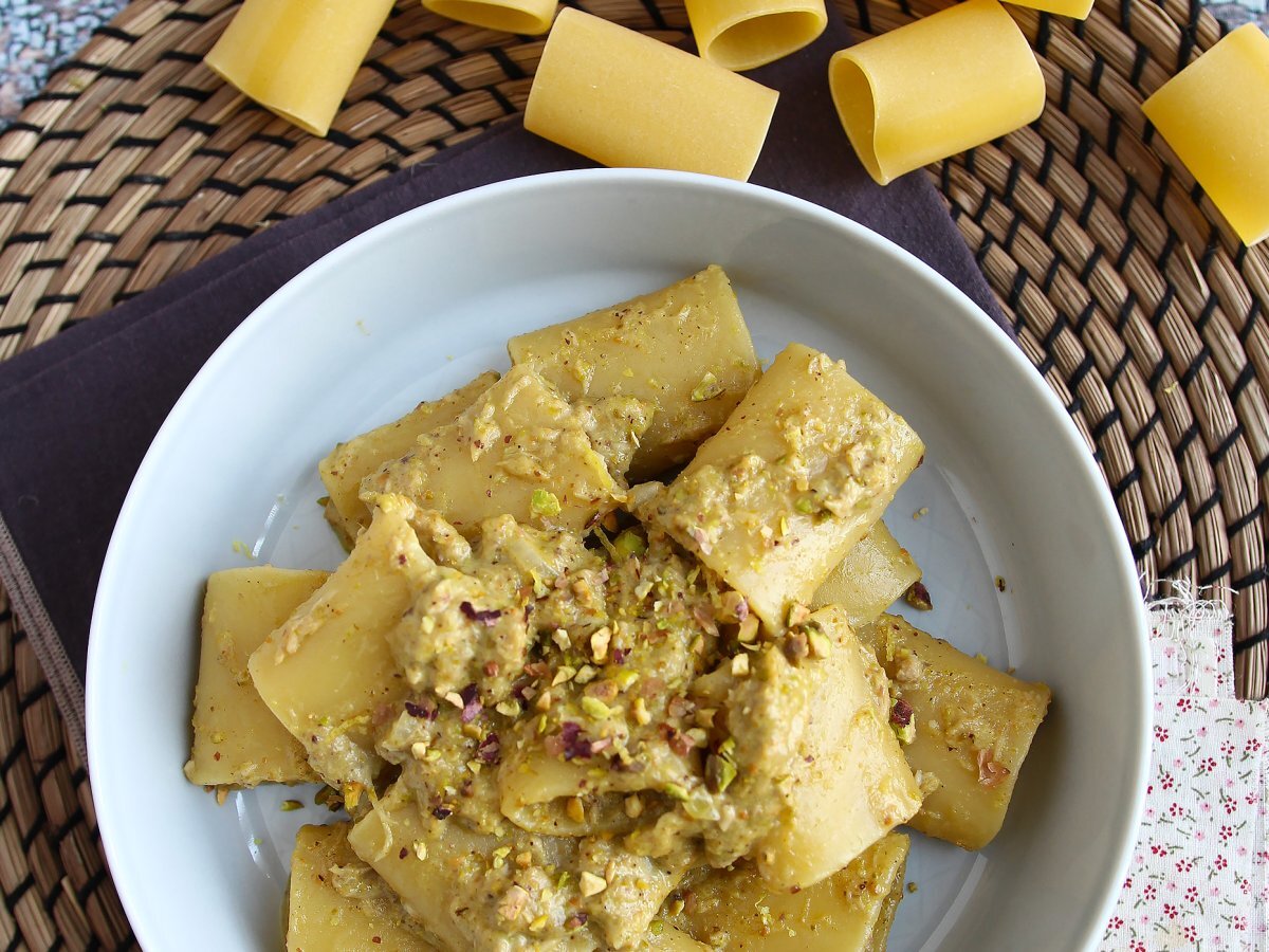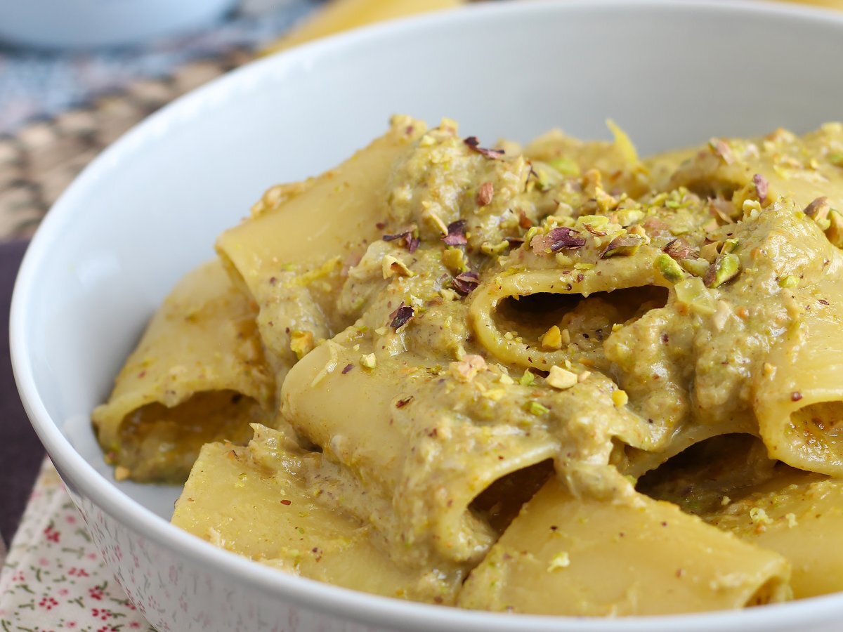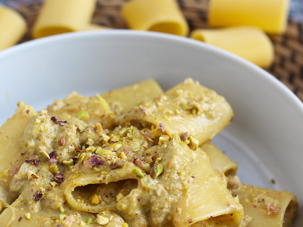 Bei der Zubereitung von Paccheri mit Thunfisch, Pistazien und Zitrone ist es sehr wichtig, das Kochwasser zu verwenden. Sie brauchen es, um das Pistazienpesto zu verdünnen, das eine sehr sämige Konsistenz hat und es Ihnen ermöglicht, einen cremigen ersten Gang zuzubereiten, ohne Sahne oder Milch hinzuzufügen.