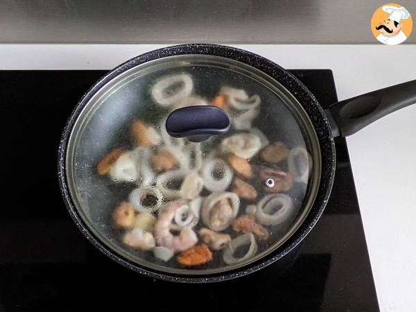 Die Nudeln mit tiefgefrorenen Meeresfrüchten sind fertig!