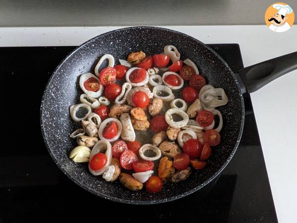 Den Knoblauch zerdrücken und in einer Pfanne mit Olivenöl anbraten. Die Meeresfrüchte kurz unter fließendem Wasser abspülen, dann gefroren in die Pfanne geben und ein paar Minuten bei geschlossenem Deckel kochen (gerade so lange, bis sie etwas weicher sind).
