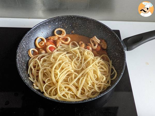 Die Nelke aus der Meeresfrüchtesauce entfernen. Die Nudeln al dente abgießen und in die Pfanne geben (falls die Soße zu dünn ist, ein paar Esslöffel Kochwasser hinzufügen).