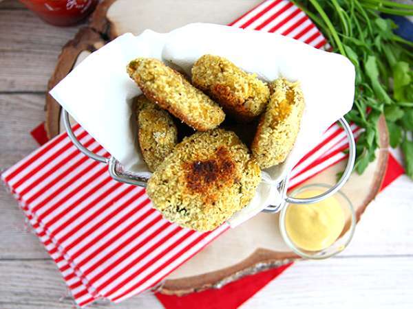 Die Nuggets in einer Pfanne mit Olivenöl auf jeder Seite bei mittlerer Hitze ca. 3 – 4 Minuten anbraten. Grillen Sie die Ränder der Nuggets.