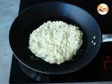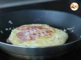 Den Teig 3 Minuten bei schwacher Hitze backen, dann umdrehen und 3 Minuten backen lassen. Dann umdrehen und 3 Minuten bei mittlerer Hitze backen, um den Speck noch etwas mehr zu rösten.