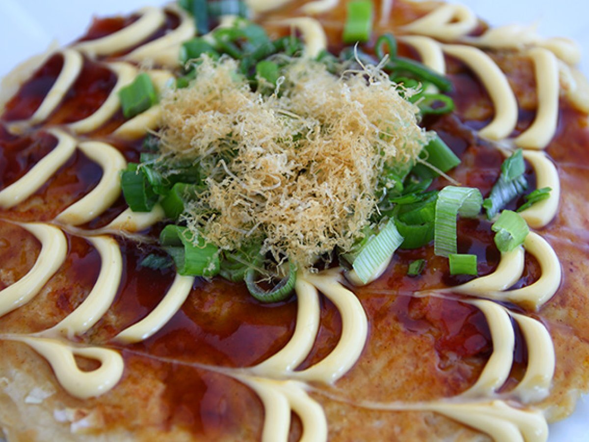 Okonomiyaki ist ein japanisches Omelett, das besonders in Osaka beliebt ist. Es wird aus einer Mischung von Mehl, Brühe, Gemüse und verschiedenen Zutaten zubereitet und kann je nach Region variieren.