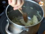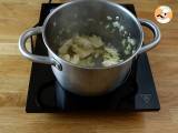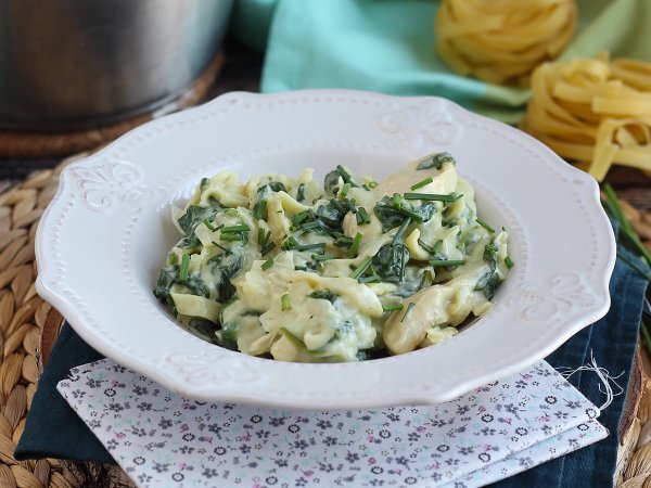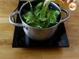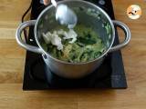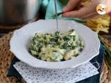 Fügen Sie Nudeln und frischen Spinat hinzu (nach und nach, während sie reduzieren). Mit der Brühe aufgießen und ständig umrühren. Das Kochen dauert etwa 10 Minuten.