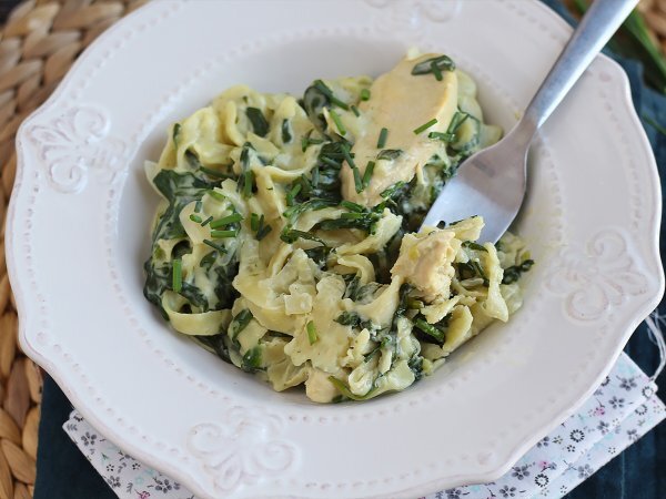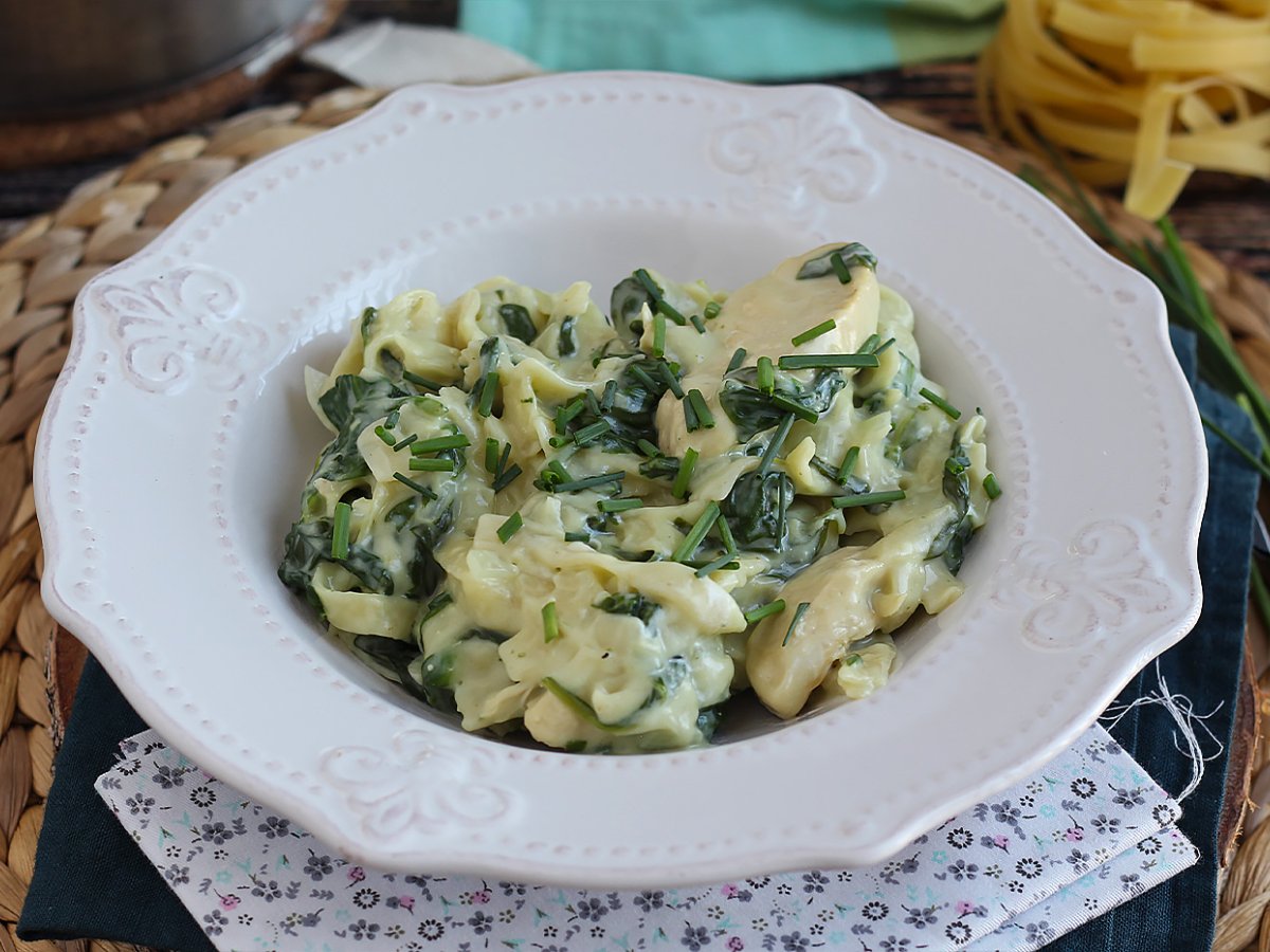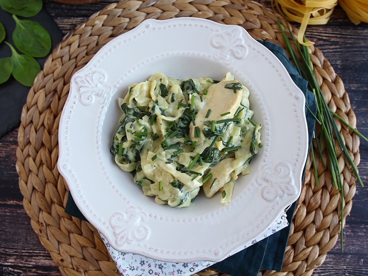 One pot pasta mit spinat, ziegenkäse und hühnchen