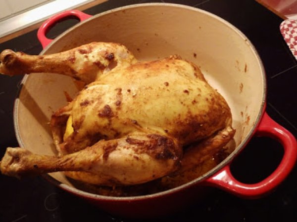 - Ofen vorheizen auf 225 ° C Vorwärmung. Gewürze mischen Sie gut mit Olivenöl. Das Huhn innen und außen einreiben und mit Salz, Zitrone, Knoblauch und Koriander in den Bauch der Henne. Das Huhn und Pinsel mit einem kleinen Gewürz Öl.