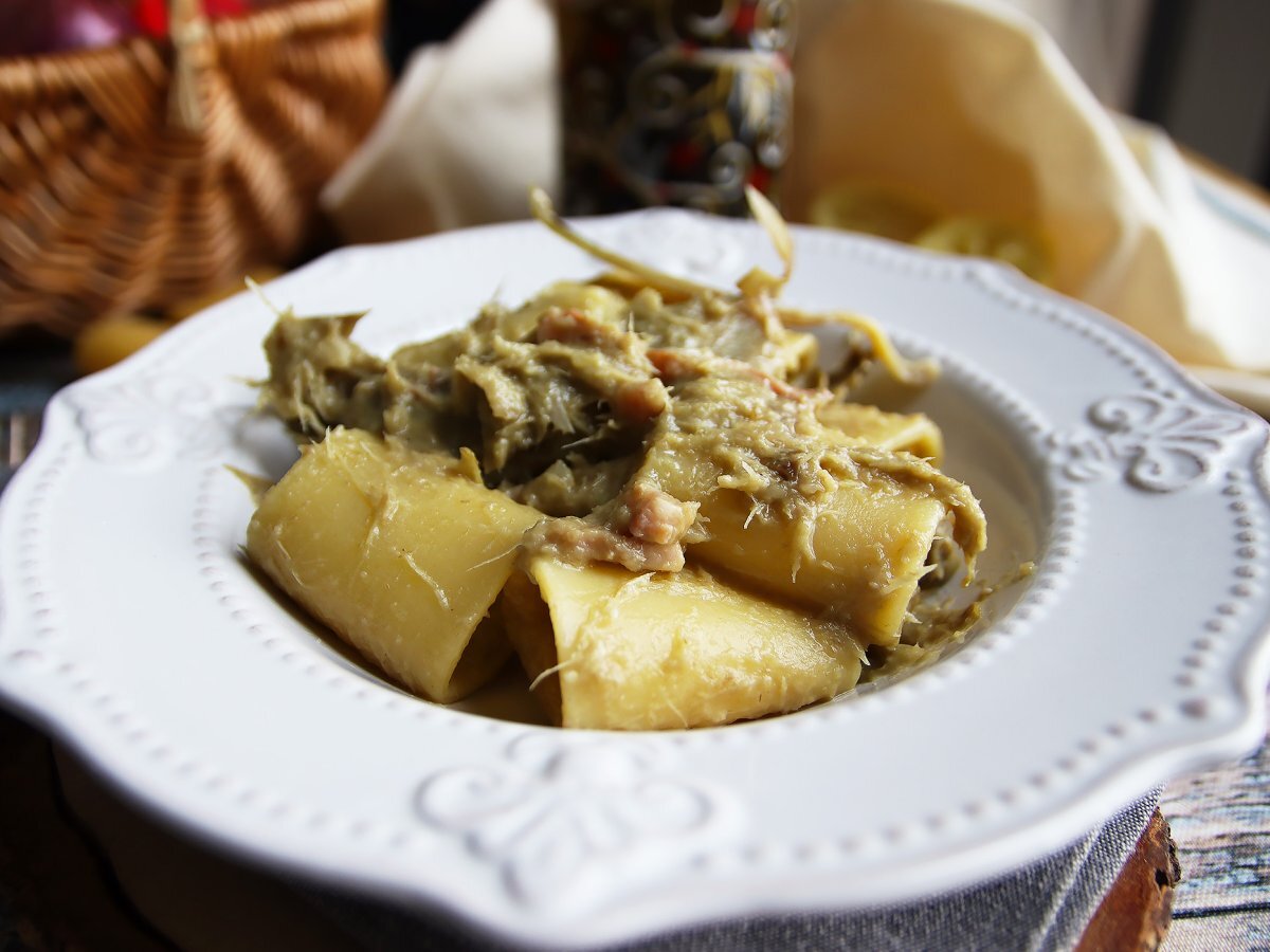- Die cremigen Paccheri mit Artischocken und Speck sind fertig!