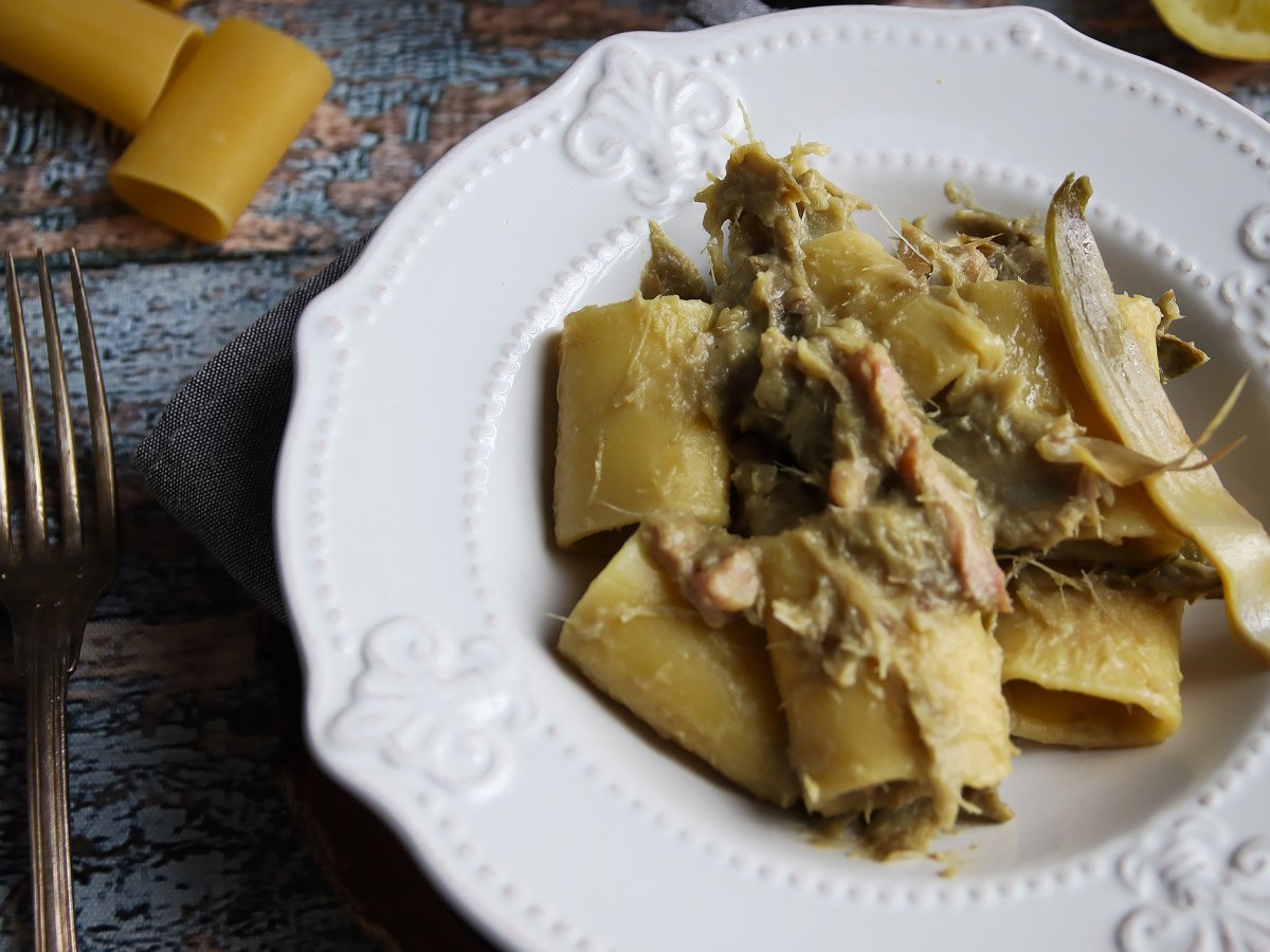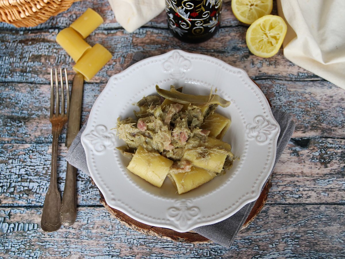 Pasta mit artischocken und speck, ein schmackhafter und leicht zuzubereitender erster gang