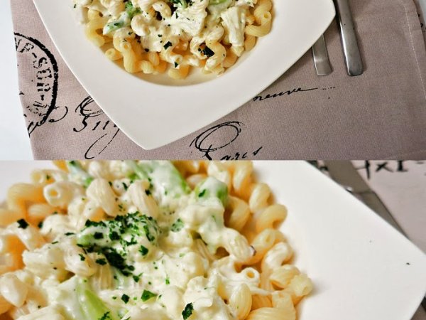 - Milch in einem Topf erwärmen und den Schmelzkäse darin langsam auflösen. Mit Pfeffer und Basilikum würzen und das bissfest gekochte und abgeseihte Gemüse untermischen.