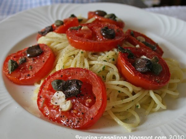 - Jede Scheibe Tomate mit Kapern, Oliven, Knoblauchscheiben, Basilikum und Thymian zu beweisen.