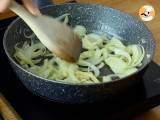 Schneiden Sie die Zwiebel in Streifen und braten Sie sie in einer Pfanne mit Olivenöl und etwas Salz an. Beiseite stellen, wenn sie glasig sind.