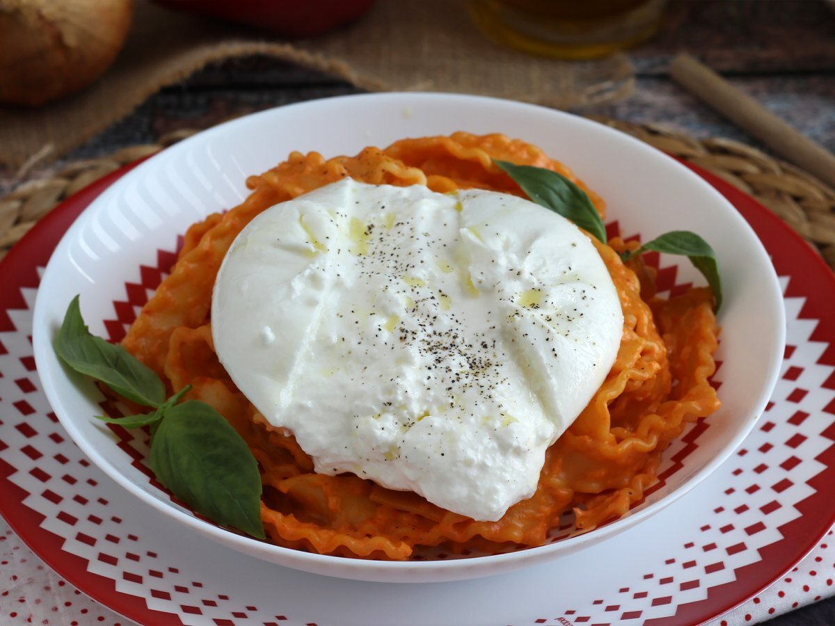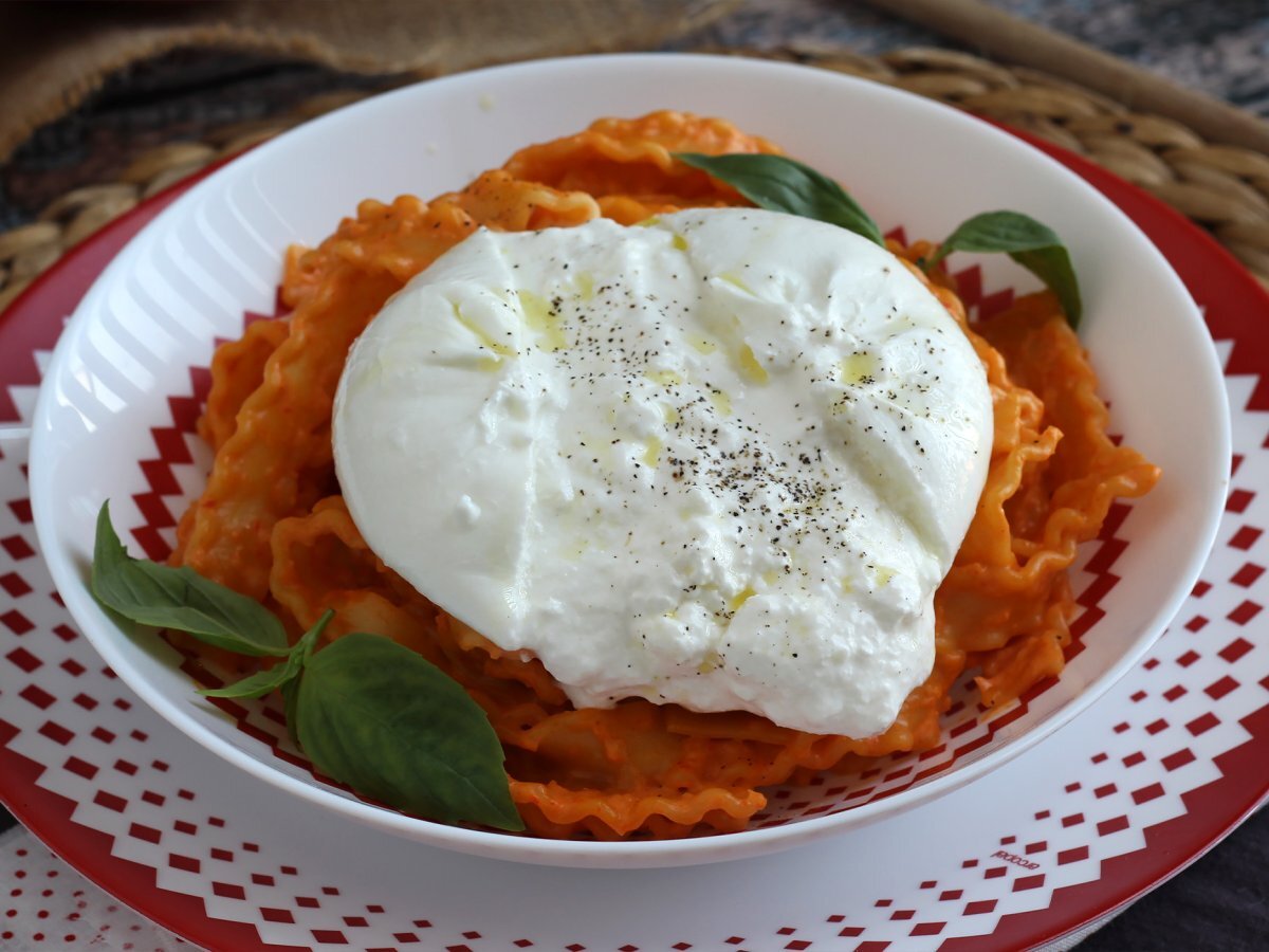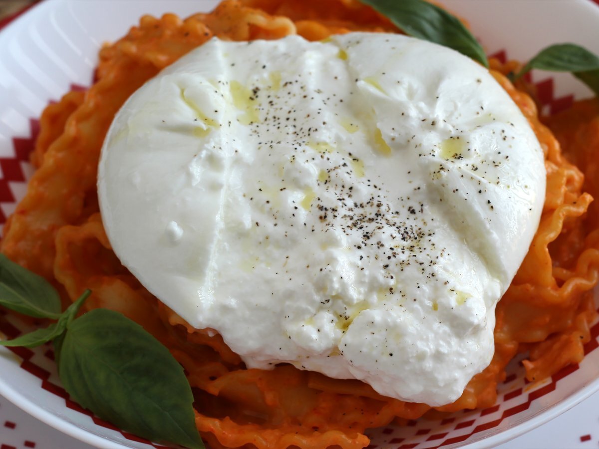 Die Nudeln in einem tiefen Teller servieren, eine Burrata darauf legen, um den Genuss zu maximieren. Burrata öffnen und mit Olivenöl beträufeln, mit Salz und Pfeffer würzen und genießen.