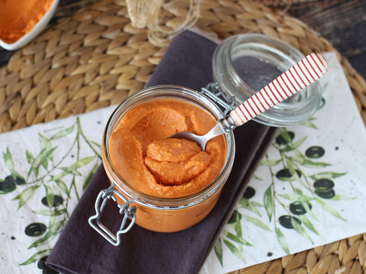 Paprika, Zwiebel, Ricotta, Pecorino, Parmesan, Tomatenmark, Salz und Olivenöl in einen Zerhacker geben und mixen, bis eine cremige Sauce entsteht.