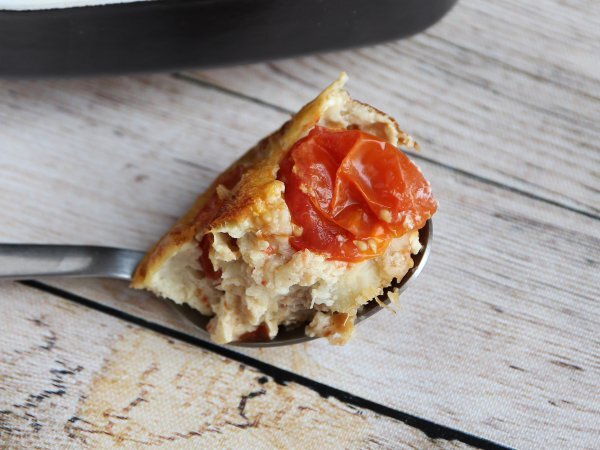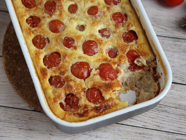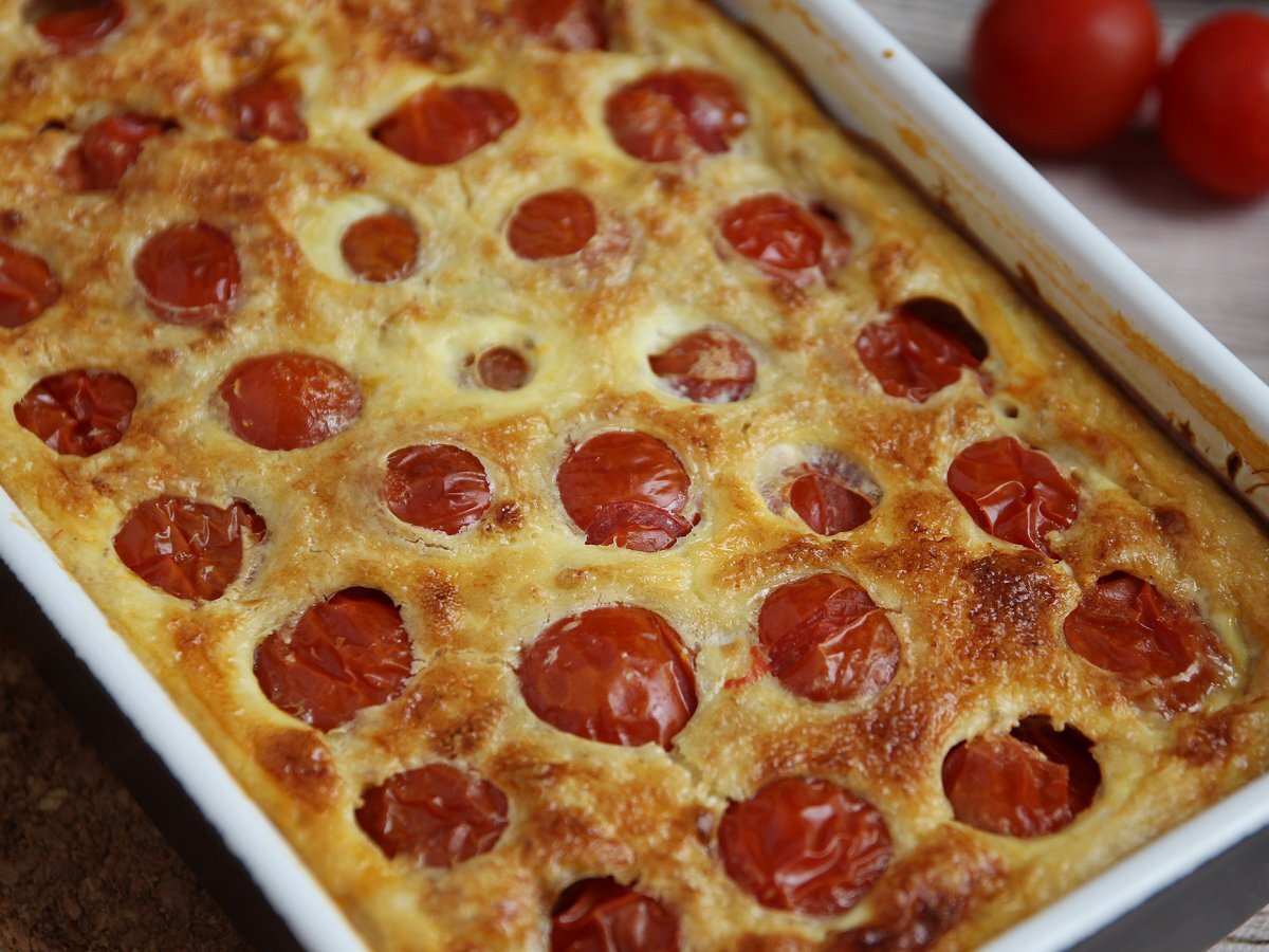 Pikante clafoutis mit kirschtomaten und thunfisch