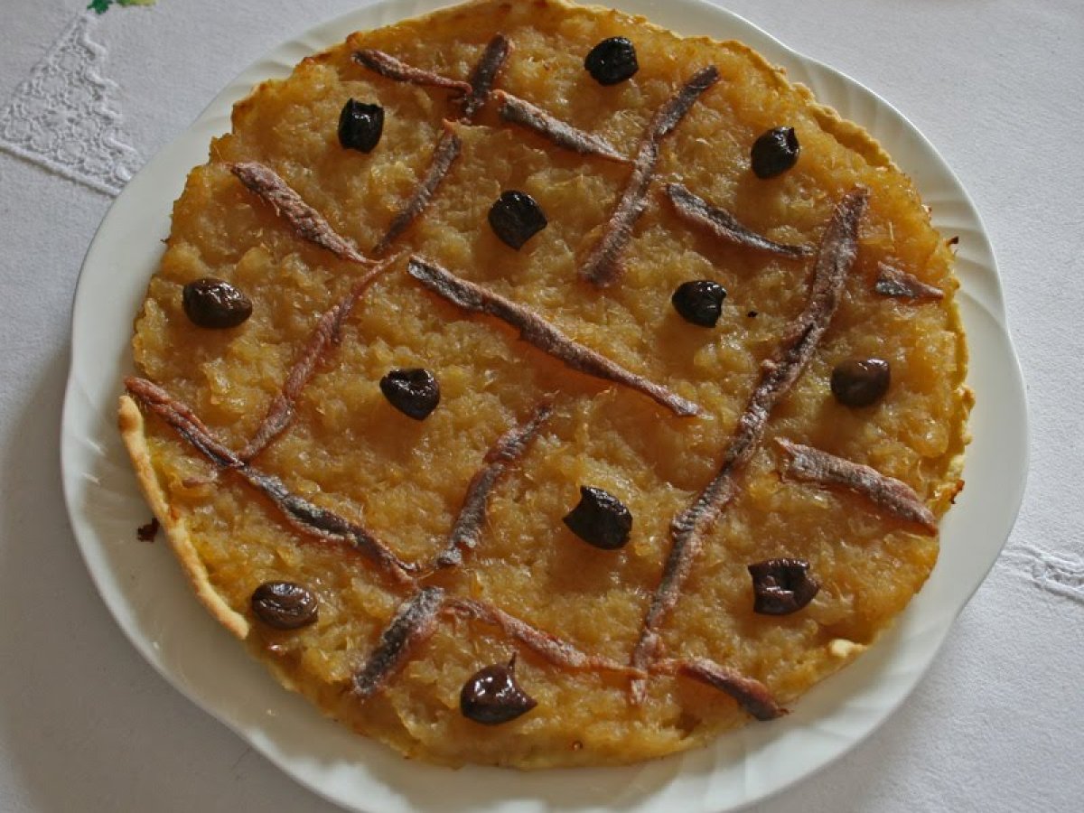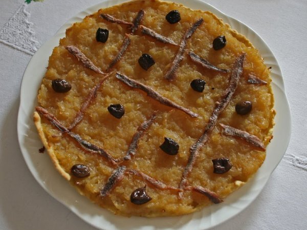 - Verteilen Sie die Sardellen und Oliven, je nach Stimmung auf der Pissaladière und drücken Sie erneut für 20 Minuten in den Ofen.