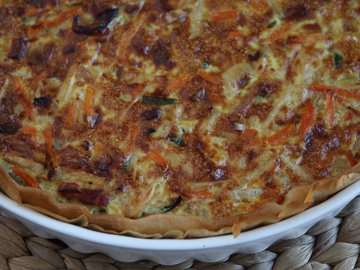 - Legen Sie Ihren Teig in eine Tarteform und stechen Sie ihn mit einer Gabel ein. Geben Sie die Gemüse-Speck-Mischung und anschließend die Tartemasse darauf.