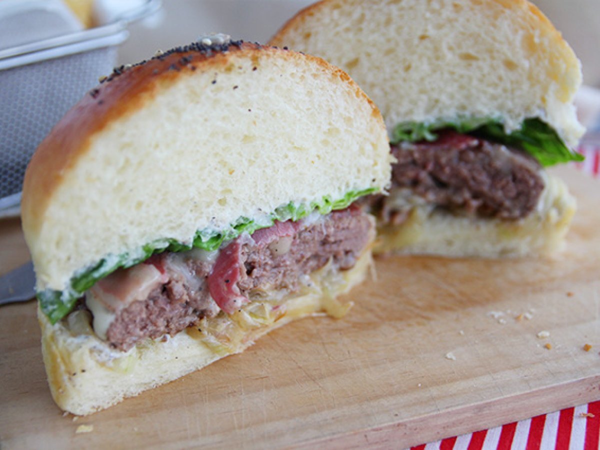 Den Burger anrichten: Auf die Zwiebelschicht das Hackfleisch und das geschmolzene Raclette, den gegrillten Pancetta und den Salat legen und das Brot verschließen. Es ist fertig !