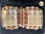 Wenn der Käse flüssig sein soll, geben Sie die Raclettescheiben zu den Waffeln in das Waffeleisen und warten Sie, bis sie schmelzen.