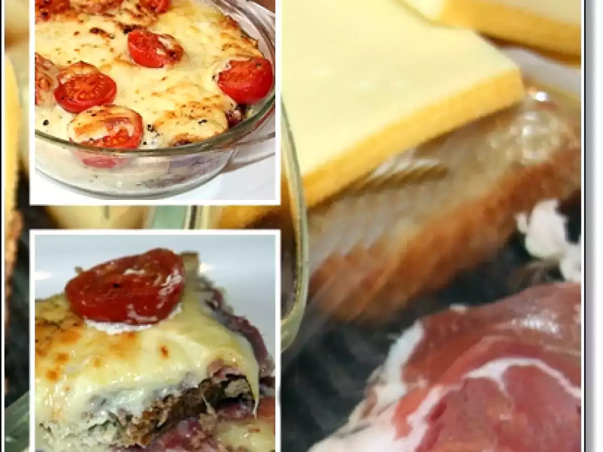- 6 Scheiben Coppa und 6 Scheiben Raclette Käse auf das Brot geben. Würzen. Vorgang wiederholen. Tomaten halbieren. Zwischen die oberste Käsescheiben schieben.