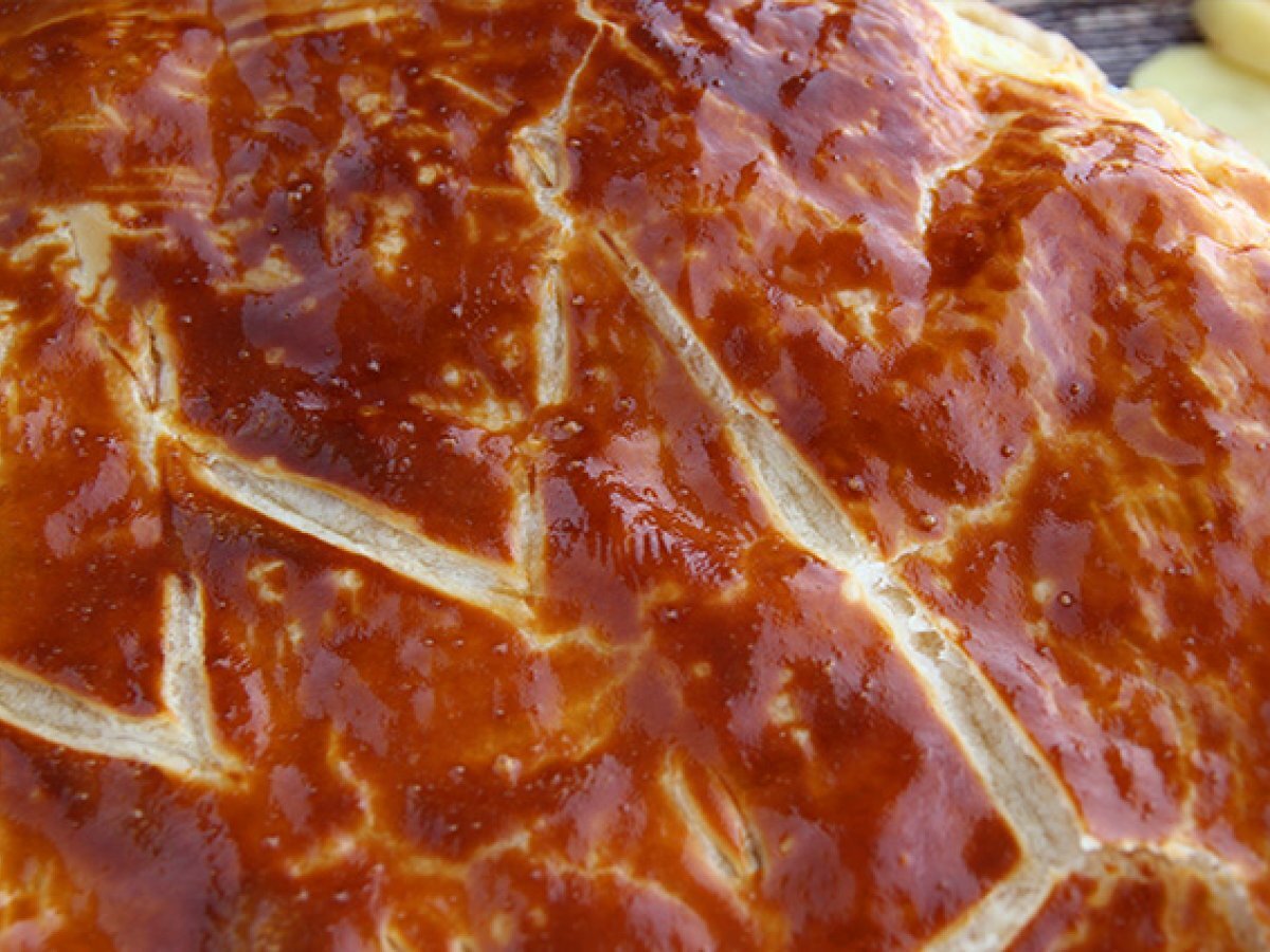 Mit Blätterteig bedecken und die Ränder versiegeln. Mit Eigelb bestreichen und dekorieren.