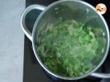 In einem großen Topf das Olivenöl erhitzen. Die gehackten Zwiebeln und die in Stücke geschnittene grüne Paprika hinzufügen.