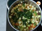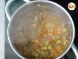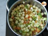 Dann die gewürfelte Zucchini und Aubergine dazugeben. Wasser und Brühwürfel hinzufügen.