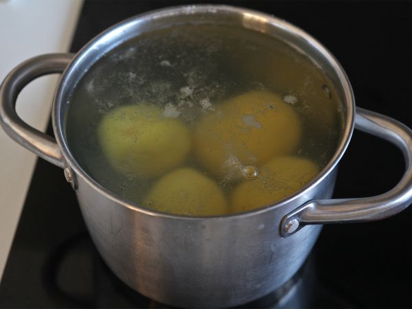 Schäle die Kartoffeln und koche sie dann 30-40 Minuten in kochendem Salzwasser.