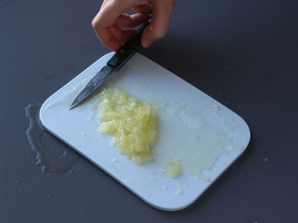 Während der Tortenboden abkühlt, die Schalotte fein schneiden, die Zitrone schälen und das Fruchtfleisch von der Zitrone abziehen.