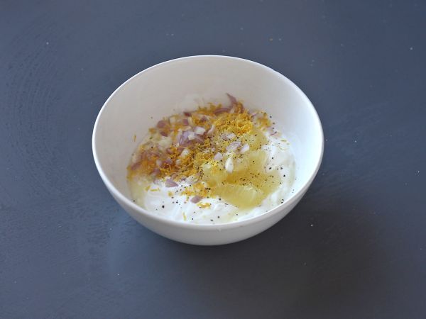 Den griechischen Joghurt mit den Supremes, etwa 3/4 der Zesten (der Rest wird zum Garnieren verwendet), den Schalotten, Salz und Pfeffer verrühren.