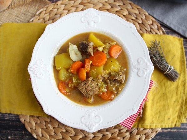 - Schalten Sie nach dieser Zeit den Herd aus und lassen Sie den gesamten Druck aus dem Schnellkochtopf durch das Ventil ab (gemäß den Anweisungen des Herstellers). Öffnen Sie die Auflaufform und servieren Sie den Eintopf in einem tiefen Teller.