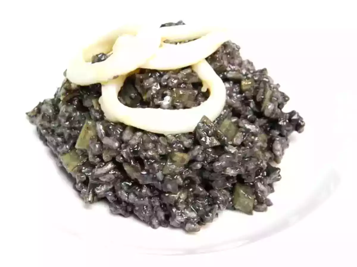 - Servieren Sie den Risotto in den Platten und verteilen die Tintenfischringe auf.
