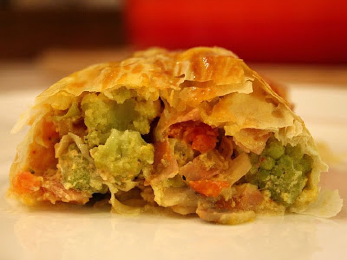 Nun die Gemüse-Masse auf das untere Drittel der Strudelblätter legen.