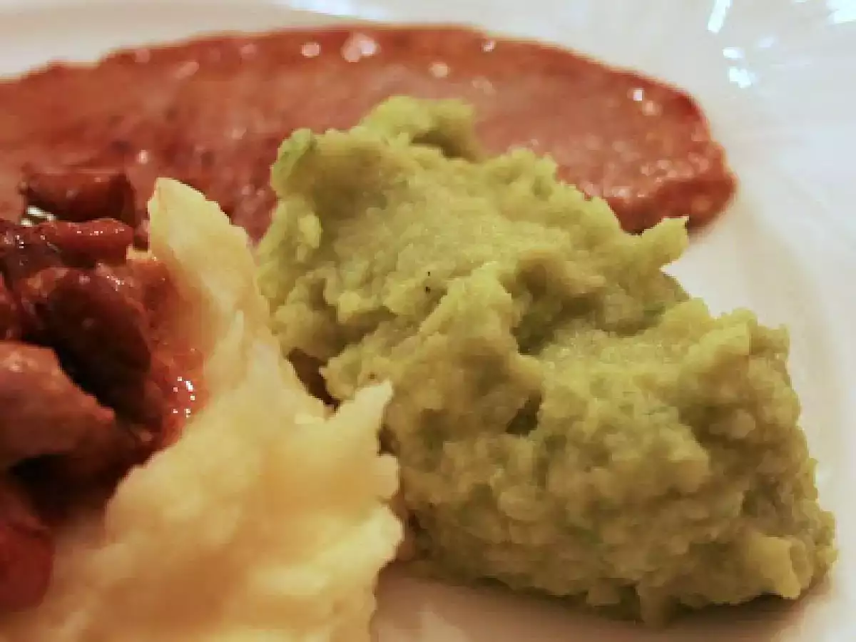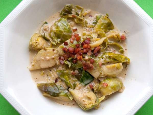 - Ablassen. Erhitzen Sie die Milch und Sahne, fügen Sie die Rosenkohl und Kartoffelpüree kurz und nicht sehr gut mit einem Stabmixer.