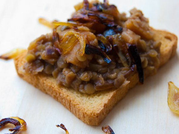 Rote linsen mit quittenkompott und karamelisierten zwiebeln