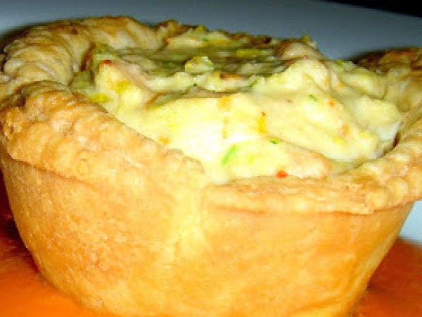 Einspritzen von Fischfarce in Torten, ganze Fülle in der Mitte, mit Fisch Farce. - Bei 160 Grad (Umluft) 15 min lassen Wanken. Etwas abkühlen lassen (hot pie, aber nicht heiß zu dienen). Keine Buttersauce servieren.