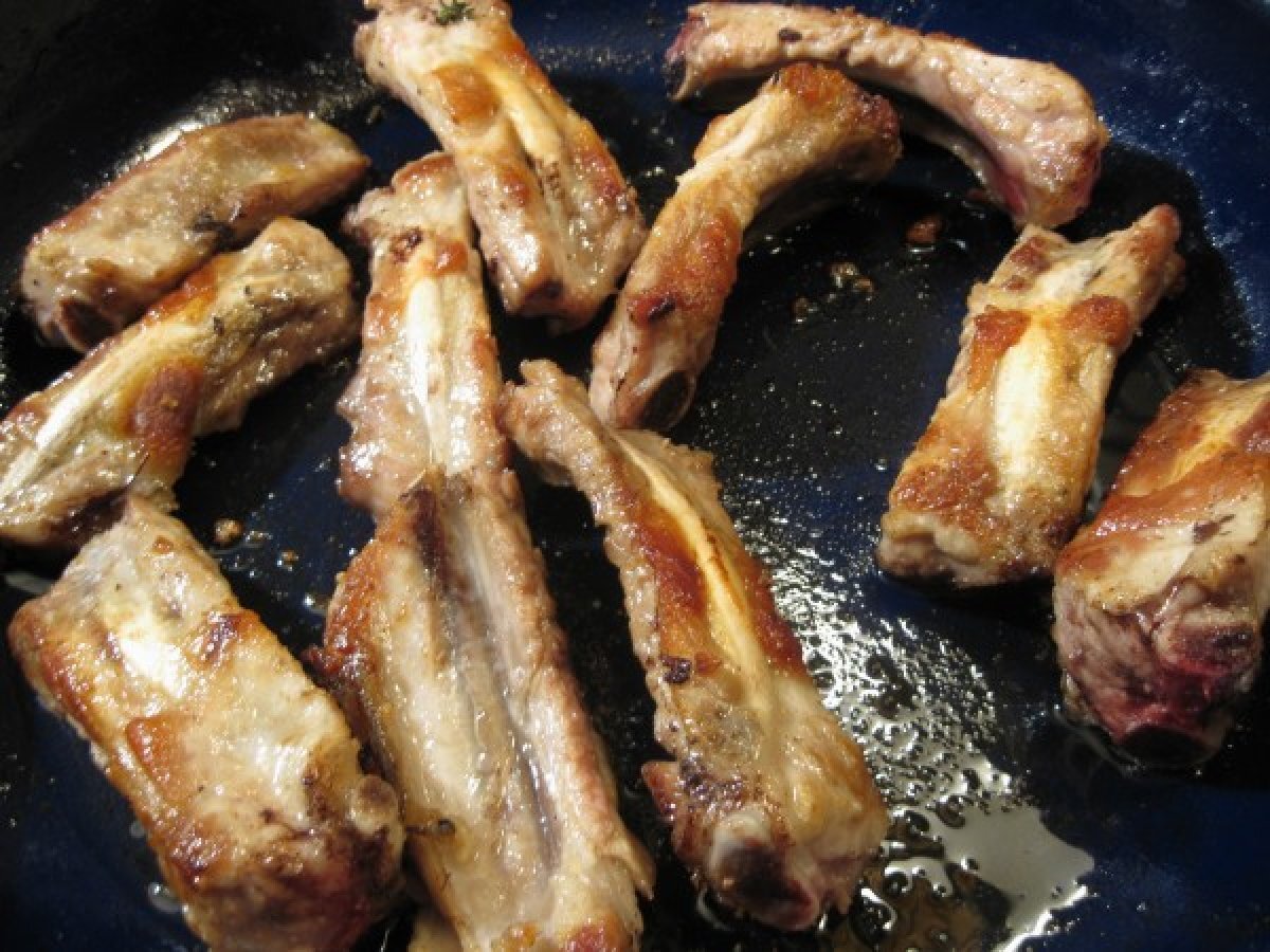 - Parallel dazu werden 500 g gebratene Schweinerippchen bei mittlerer Hitze in Olivenöl mit Sorgfalt und sparsam.